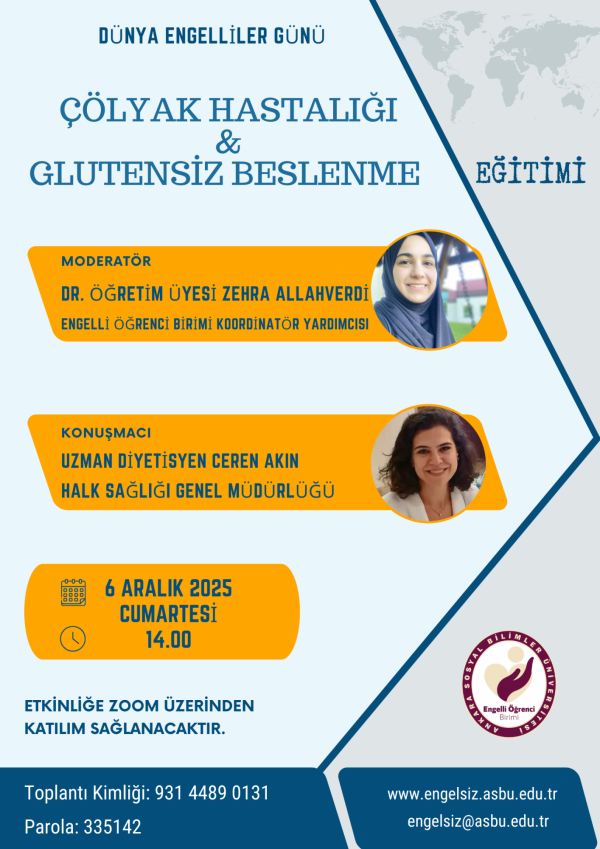 Engelli Öğrenci Birimi Koordinatör Yardımcısı Dr. Öğr. Üyesi Zehra Allahverdi tarafından moderatörlüğü yürütülecek eğitimde, Sağlık Bakanlığı Halk Sağlığı Genel Müdürlüğü’nden Uzman Diyetisyen Ceren Akın, çölyak hastalığının tanımı, teşhisi, tedavisi, glütensiz beslenmesi gereken bireyler ve dikkat edilmesi gereken hususlar hakkında katılımcıları bilgilendirecek ve soruları yanıtlayacaktır.